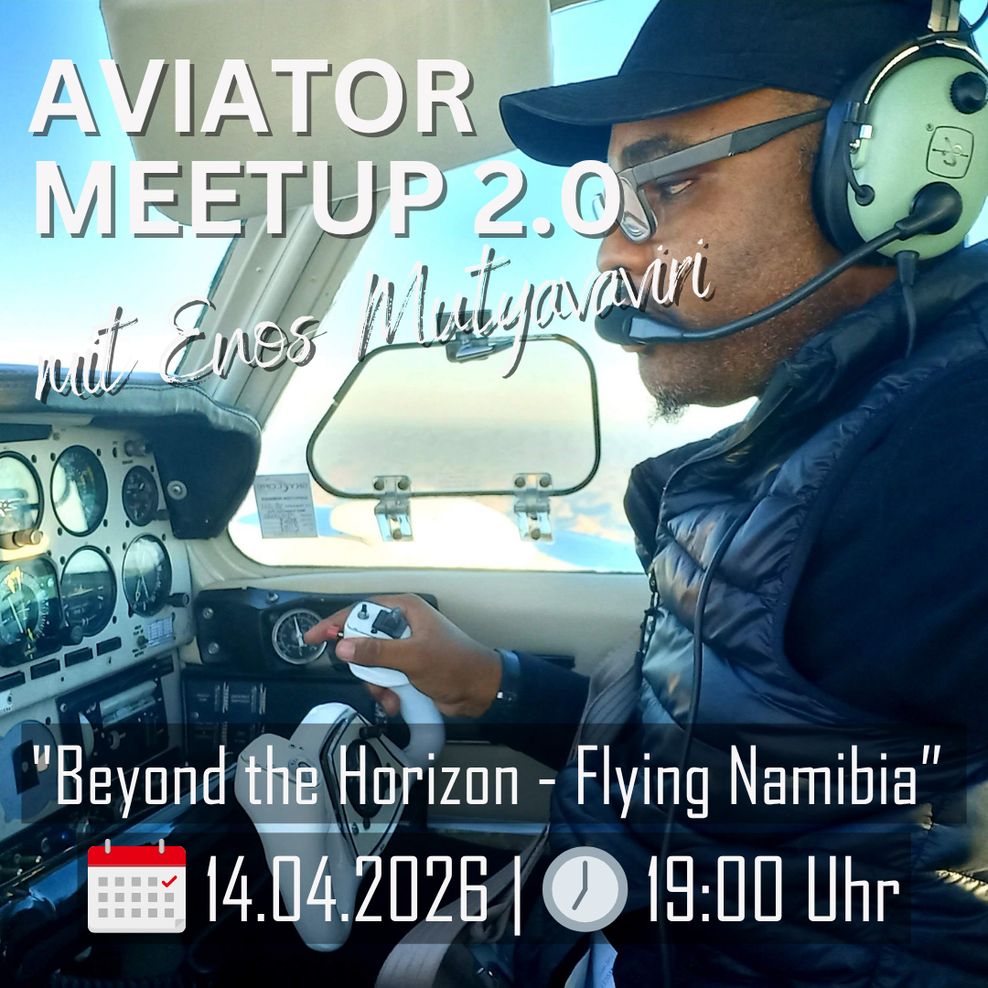 Online Aviator Meetup 2.0 | 14.04.2026 | 19:00 Uhr (englisch) 🛩️❤️Beyond the Horizon – Flying Namibiamit Enos MutyavaviriDieses Mal nehmen wir Euch mit nach Namibia – eines der faszinierendsten Länder für Privatpiloten weltweit. Gemeinsam werfen wir einen Blick auf das